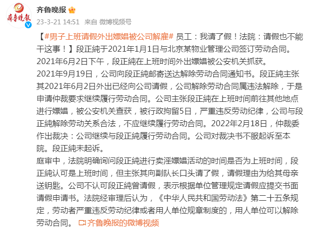 庭审中,法院明确询问段正純进行卖淫嫖娼活动的时间是否为上班时间,段正純认可是上班时间,但主张其向副队长口头请了假,请假理由为给其母亲送钥匙。公司不认可段正純曾请假,表示根据单位管理规定请假应提交书面请假申请书。法院经审理后认为,《中华人民共和国劳动法》第二十五条规定,劳动者严重违反劳动纪律或者用人单位规章制度的,用人单位可以解除劳动合同。
