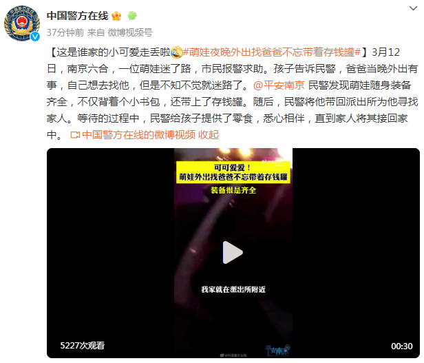 3月12日,南京六合,一位萌娃迷了路,市民报警求助。孩子告诉民警,爸爸当晚外出有事,自己想去找他,但是不知不觉就迷路了。@平安南京 民警发现萌娃随身装备齐全,不仅背着个小书包,还带上了存钱罐。随后,民警将他带回派出所为他寻找家人。等待的过程中,民警给孩子提供了零食,悉心相伴,直到家人将其接回家中。