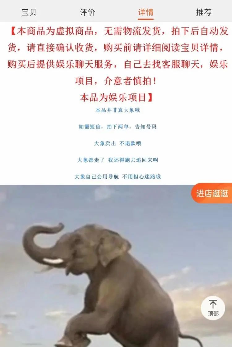 “本商品为虚拟商品,无需物流发货,拍下后自动发货,请直接确认收货,购买前请详细阅读宝贝详情,购买后提供娱乐聊天服务,自己去找客服聊天,娱乐项目,介意者慎拍!”而在商品详情页中,记者看到,该店铺明确说明,该商品为娱乐项目,并非真正的大象,“大象卖出,不退款。大象都走了,我还得跑去追回来啊。”
