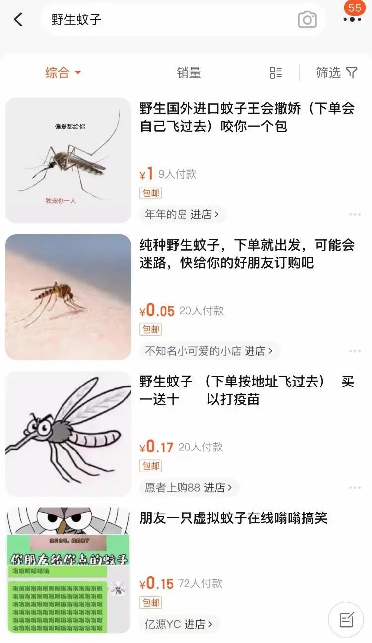 而记者搜索“野生蚊子”时,也显示有多家店铺销售。其中,售价最低的为0.05元,发货地点为北京,月销量超300单。