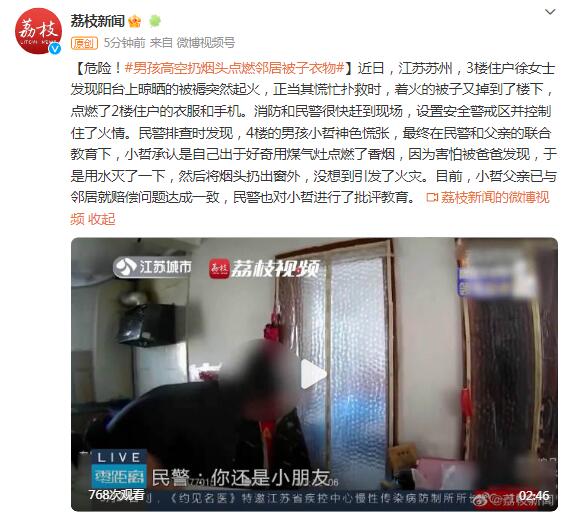 近日,江苏苏州,3楼住户徐女士发现阳台上晾晒的被褥突然起火,正当其慌忙扑救时,着火的被子又掉到了楼下,点燃了2楼住户的衣服和手机。消防和民警很快赶到现场,设置安全警戒区并控制住了火情。民警排查时发现,4楼的男孩小哲神色慌张,最终在民警和父亲的联合教育下,小哲承认是自己出于好奇用煤气灶点燃了香烟,因为害怕被爸爸发现,于是用水灭了一下,然后将烟头扔出窗外,没想到引发了火灾。目前,小哲父亲已与邻居就赔偿问题达成一致,民警也对小哲进行了批评教育。
