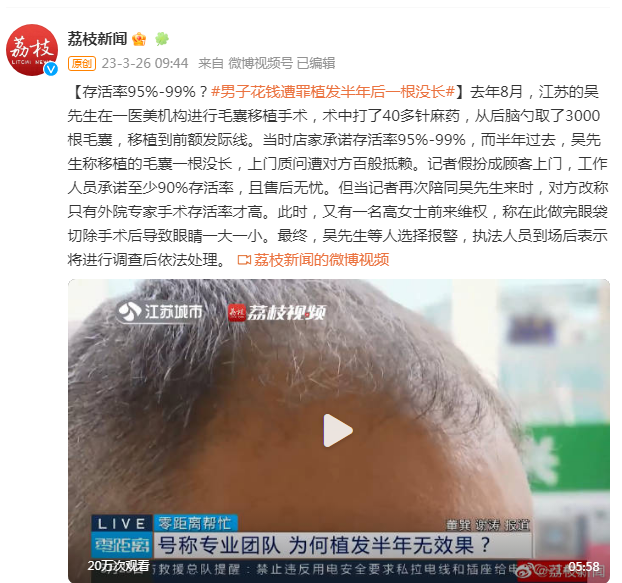 去年8月,江苏的吴先生在一医美机构进行毛囊移植手术,术中打了40多针麻药,从后脑勺取了3000根毛囊,移植到前额发际线。当时店家承诺存活率95%-99%,而半年过去,吴先生称移植的毛囊一根没长,上门质问遭对方百般抵赖。记者假扮成顾客上门,工作人员承诺至少90%存活率,且售后无忧。但当记者再次陪同吴先生来时,对方改称只有外院专家手术存活率才高。此时,又有一名高女士前来维权,称在此做完眼袋切除手术后导致眼睛一大一小。最终,吴先生等人选择报警,执法人员到场后表示将进行调查后依法处理。