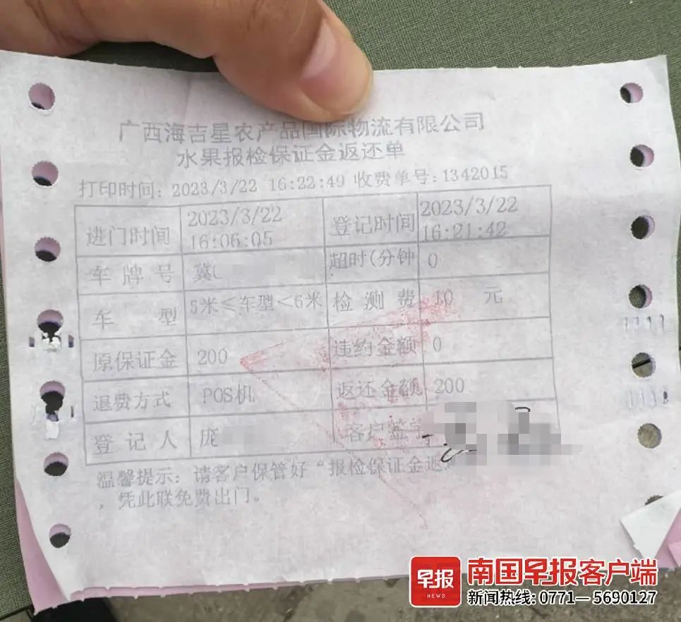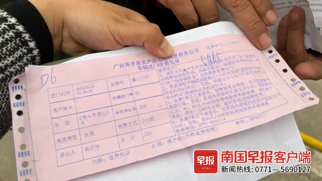 对海吉星市场不熟悉的高先生以为,报备和退押金是在一起办理的同一个程序,于是他缴纳了50元车辆进门费和200元报检保证金后,到D6区报检结算服务点,另花费10元检测费完成水果报检,最后拿回了200元保证金。