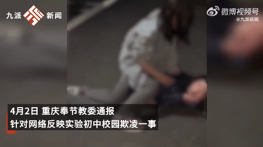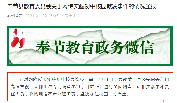奉节县教育委员会关于网传实验初中校园欺凌事件的情况通报针对网络反映实验初中校园欺凌一事,4月1日,县教委、县公安局等部门高度重视,立即组成专门调查小组,目前正在进行全面调查。对相关涉事和责任人员,将按规定严肃处理问责,坚决守住校园一方净土。