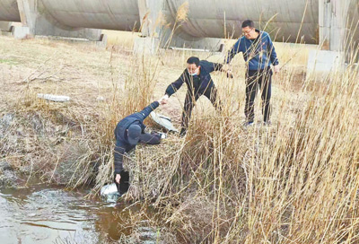 排查人员在黄河河津段沿线对排污口水质进行取样。