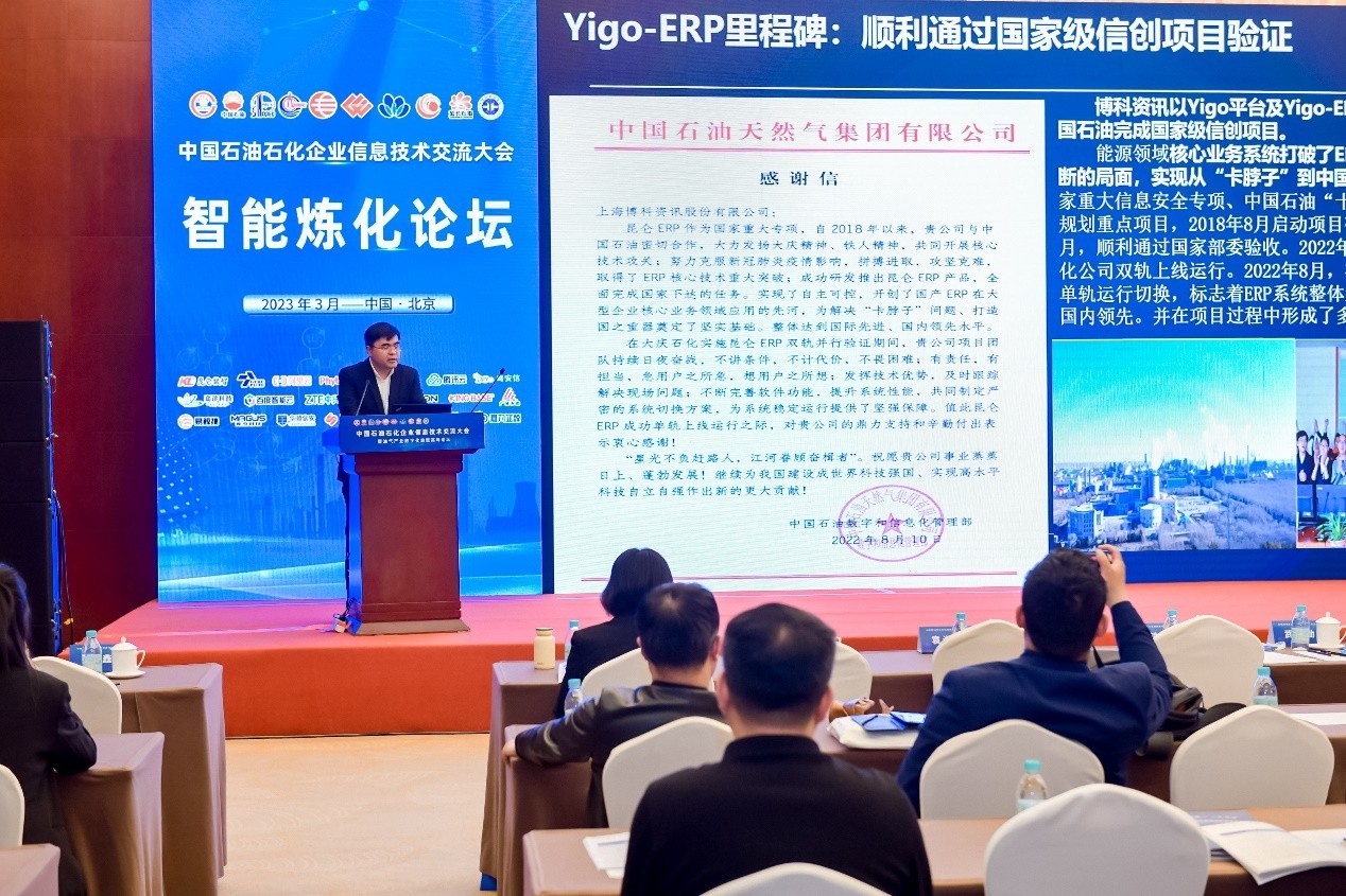 “博科资讯是石油化工行业优质的数字化服务商,博科ERP也是中国石油集团数字化大平台核心组件。” 博科资讯北京公司副总经理付志宇介绍道,博科资讯以Yigo平台及博科ERP产品,助力中国石油完成了国家信创项目。系统功能全面、性能优越、技术先进、安全上自主可控,顺利完成国家验收。标志着能源领域核心业务系统打破了ERP产品长期被国外垄断的局面,实现从“卡脖子”到中国智造的跨越。