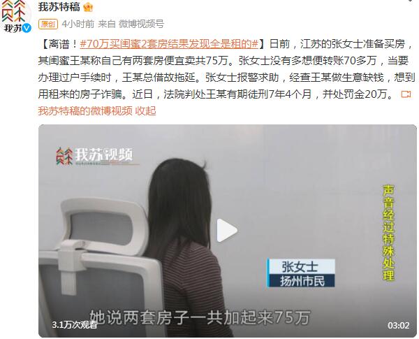 日前,江苏的张女士准备买房,其闺蜜王某称自己有两套房便宜卖共75万。张女士没有多想便转账70多万,当要办理过户手续时,王某总借故拖延。张女士报警求助,经查王某做生意缺钱,想到用租来的房子诈骗。近日,法院判处王某有期徒刑7年4个月,并处罚金20万。