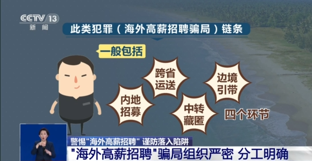 通过以上的案子,我们来对海外高薪招聘骗局流程做一个简单的梳理:此类犯罪的链条一般包括内地招募、跨省运送、中转藏匿、边境引带四个环节。
