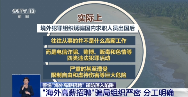实际上,境外犯罪组织诱骗国内求职人员出国后,往往从事的并不是什么高薪工作,而是电信诈骗、赌博、贩毒和色情等四类违法犯罪活动,严重时甚至遭受限制自由和虐待伤害等巨大危险。
