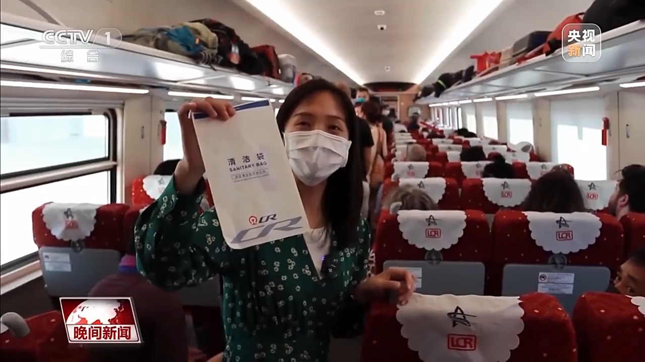 总台记者杨探骊:我算是知道这个车票为什么那么难买了,座无虚席,全是人。老挝的动车跟中国的动车真是亲姐妹,用的是同款清洁袋。