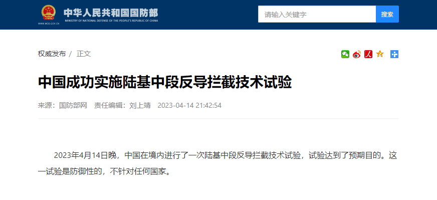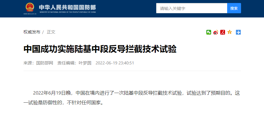 这是我国第7次对外公开宣布进行陆基反导技术试验。