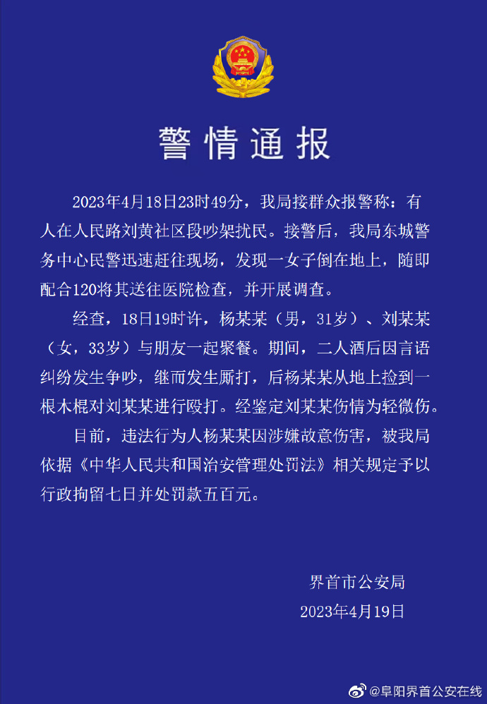 经查,18日19时许,杨某某 (男,31岁) 、刘某某(女,33岁) 与朋友一起聚餐。期间,二人酒后因言语纠纷发生争吵,继而发生厮打,后杨某某从地上捡到一根木棍对刘某某进行殴打。经鉴定刘某某伤情为轻微伤。