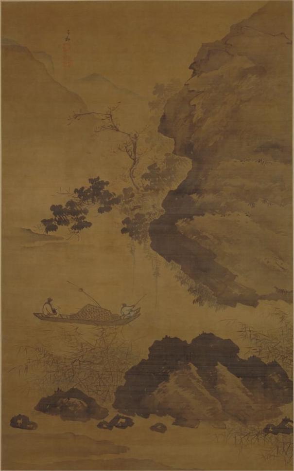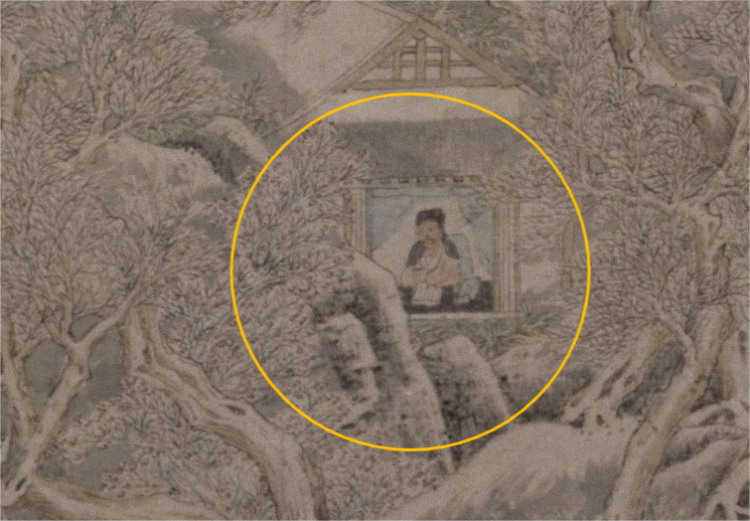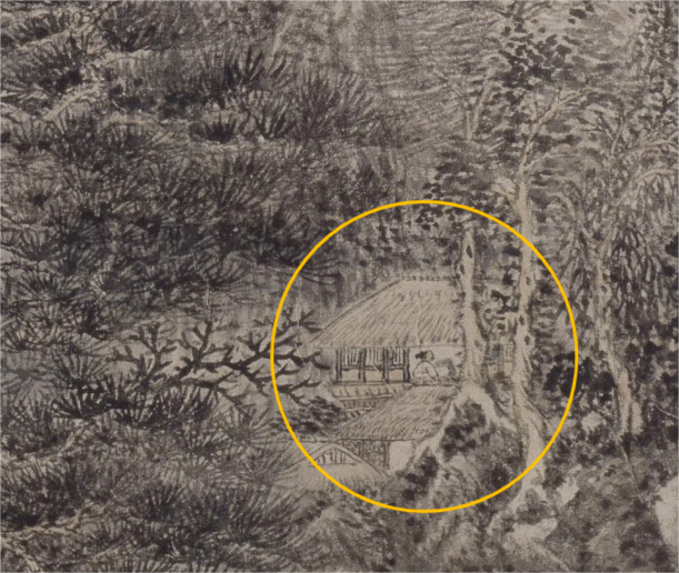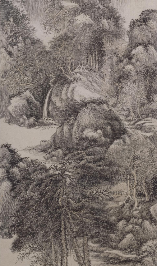 白云、瀑布、楼阁穿插于重峦叠嶂的林木间,一派气象万千的苍郁景致。有一人于山坞草堂内临窗读书。