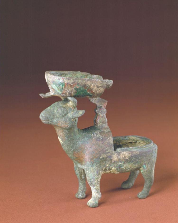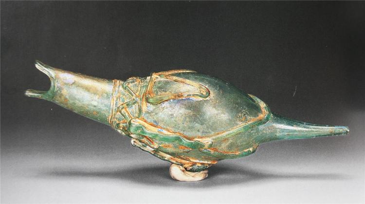 下面这个鸭形玻璃注重心在前,用时,将水由鸭嘴注入,当鸭腹中水量充至一半时,前后就会平衡,符合古文献记载的“虚而欹,中而正,满而覆”的构造特点,它的用途很可能相当于我国古代的欹器。