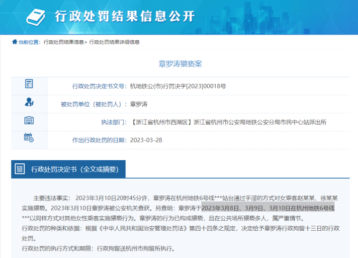 近日,浙江省杭州市公安局公开的一批行政处罚结果信息引发热议。其中包括16条猥亵女性或侵犯他人隐私违法者的罚款或拘留等处罚决定,多数违法行为发生在地铁或公交车等公共场所。值得注意的是,这些处罚结果信息中,公布了被处罚人的完整姓名和违法细节,被网友称为公示“色狼”。