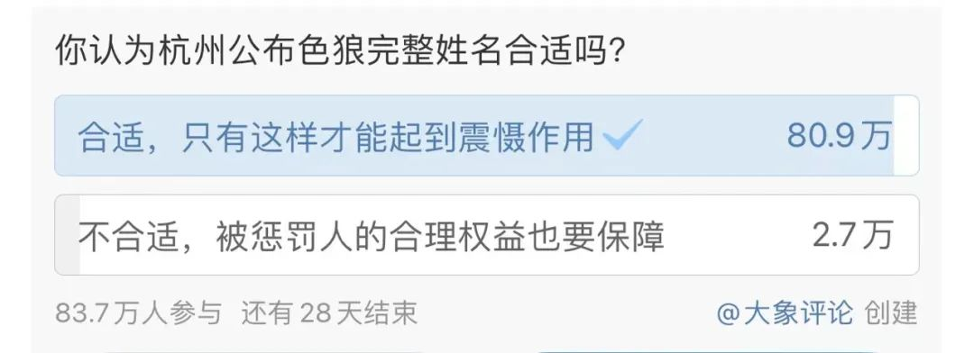对此,不少人拍手称快——一项有80多万名网友参与的微博投票显示,97%的投票者支持公布“色狼”完整姓名;也有人表示担忧——认为公开“色狼”处罚结果会侵犯个人隐私权,是对被处罚者的“二次惩罚”,也会“误伤”同名者。