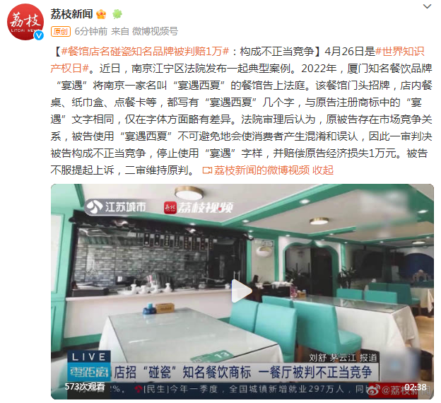 近日,南京江宁区法院发布一起典型案例。2022年,厦门知名餐饮品牌“宴遇”将南京一家名叫“宴遇西夏”的餐馆告上法庭。该餐馆门头招牌,店内餐桌、纸巾盒、点餐卡等,都写有“宴遇西夏”几个字,与原告注册商标中的“宴遇”文字相同,仅在字体方面略有差异。法院审理后认为,原被告存在市场竞争关系,被告使用“宴遇西夏”不可避免地会使消费者产生混淆和误认,因此一审判决被告构成不正当竞争,停止使用“宴遇”字样,并赔偿原告经济损失1万元。被告不服提起上诉,二审维持原判。