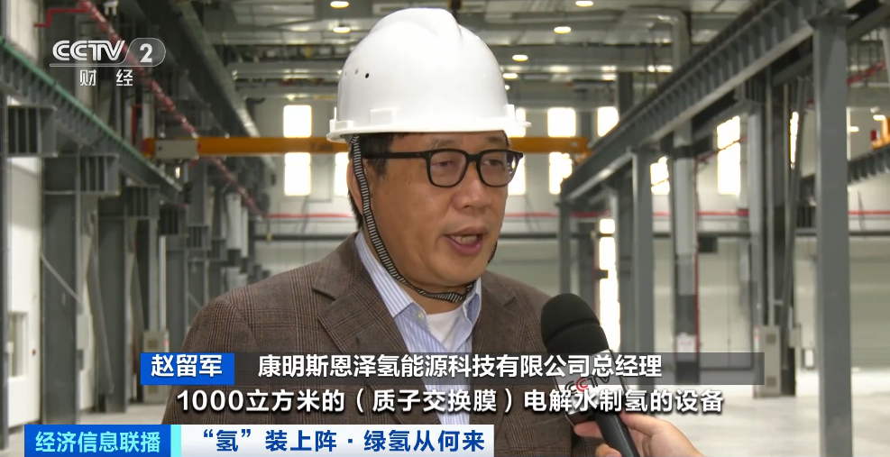 在四川德阳,记者来到了小虎岛示范项目制绿氢设备的生产企业,它是通过质子交换膜电解水制氢,比较适合应用在风电光伏项目,目前设备还没有大规模量产,成本比较高。