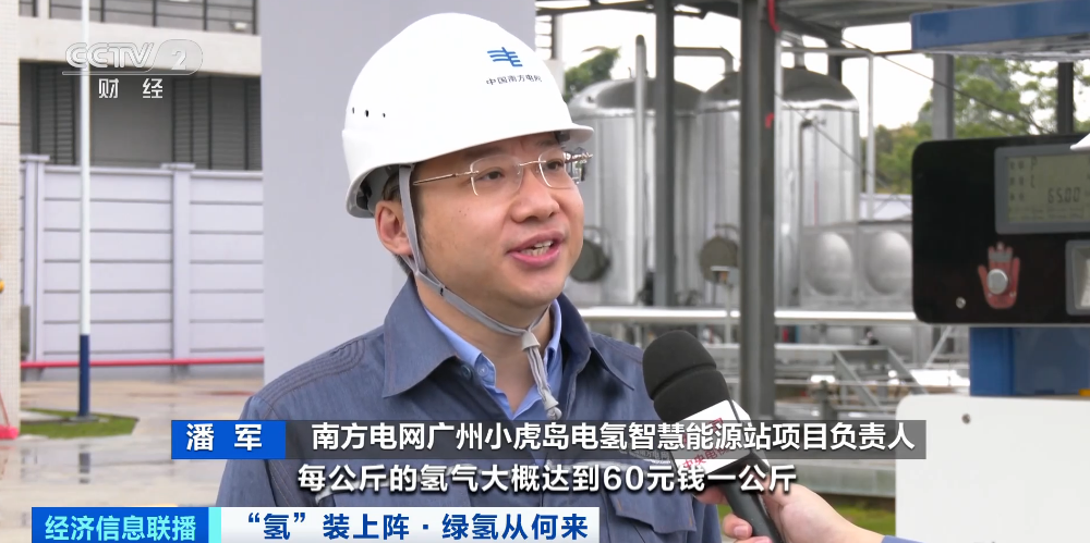 南方电网广州小虎岛电氢智慧能源站项目负责人 潘军: 广州市目前的加氢站每公斤氢气大概达到60元一公斤,折算成电价大概是1.2元每度电,如果通过这种模式,绿电到绿氢,它的经济性就很好了。