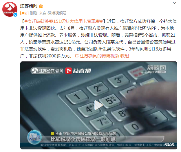 近日,宿迁警方成功打掉一个特大信用卡非法套现团伙。去年8月,宿迁警方发现有人推广某智能"代还"APP,为本地用户提供线上还款、养卡服务,涉嫌非法套现。随后,民警横跨5个省市、抓获21人,该案涉案流水高达151亿元。公司负责人段某交代,自己曾因债台高筑使用过非法套现软件,看到商机后,便自招团队研发类似软件,3年时间吸引16万多用户,非法获利2000多万元。