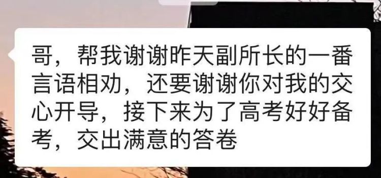 到了晚上,小程给龚健聪发去了微信,“哥,帮我谢谢副所长对我的一番言语相劝,还要谢谢你对我的交心开导,接下来好好备考,交出满意的答卷!”