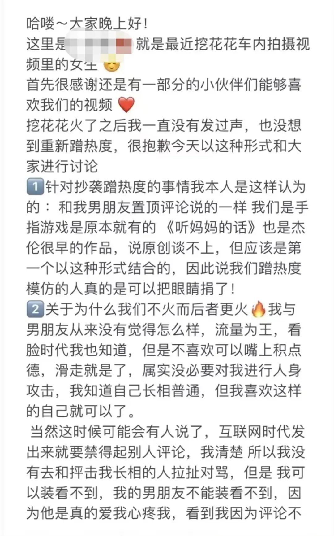 林女士也表示,这首歌能够火,她和男朋友都觉得是一件特别开心的事情,但是有热度就会有关注。目前网友的言论已经影响到了她的个人生活,后期她不会再理会,只想认真记录自己的生活。