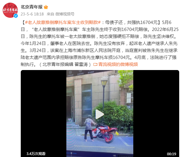 5月6日,“老人故意推倒摩托车案”车主陈先生终于收到16704元赔偿。2022年6月25日,陈先生的摩托车被一老太故意推倒,她态度强硬拒不赔偿,陈先生坚决维权。今年1月24日,肇事老人在医院去世。陈先生没有放弃,起诉老人遗产继承人朱先生。3月24日,该案在上海市浦东新区人民法院开庭,当庭宣判被告朱先生在继承陆老太遗产范围内承担赔偿原告陈先生摩托车损16704元。4月底,法院进行了强制执行。(北京青年报编辑 翟雷涛)