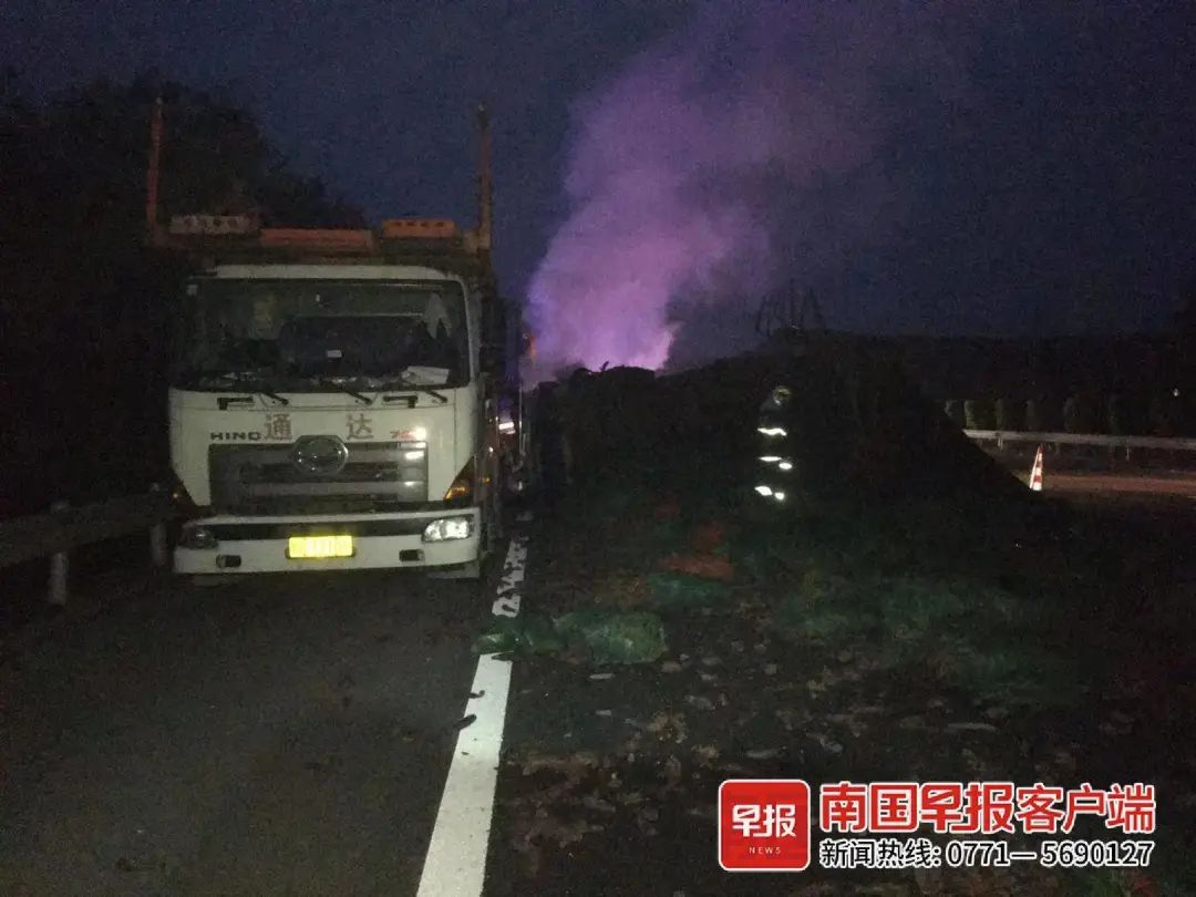 事故发生在当天凌晨4时许。事发后,广西高速交警支队六大队民警赶到现场看到,一辆桂A牌小货车侧翻在第三、第四车道上,车上货物撒落地面,车身已被烧成空壳,现场浓烟滚滚。