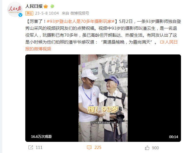 【厉害了!93岁登山老人是70多年摄影玩家】5月2日,一条93岁摄影师独自登秀山采风的视频获网友们的点赞祝福。视频中93岁的摄影师叫潘云生,是一名退役军人,玩摄影已有70多年,虽已高龄但开朗豁达、热爱生活。有网友认出了这是小时候为他们拍照的潘爷爷感叹道:“莫道桑榆晚,为霞尚满天”。