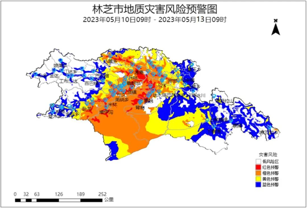 5 月 10 日~13 日,墨脱、波密县的大部乡镇地质灾害预警等级为 2 级,米林县、巴宜区大部及朗县的金东,察隅县的察瓦龙、上察隅、下察隅等乡镇地质灾害预警等级为 3 级,康玉、错高、更章、仲达、洞嘎、朗镇、古玉、古拉、竹瓦根等乡镇地质灾害预警等级为 4 级,其他地区发生地质灾害的风险较低。