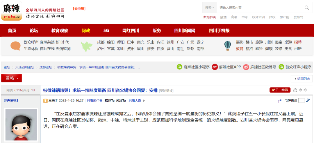 日前,网友在四川麻辣社区发帖称