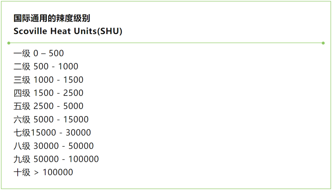 国际上最早衡量辣度的方法是1912年美国药物化学家WilburLincolnScoville的SHU(斯科维尔辣度指数),它表示物质被稀释到感觉不到辛辣的次数。这个方法测出的辣椒辣度从0个单位到几十万个单位,SHU的测辣原理也沿用至今。