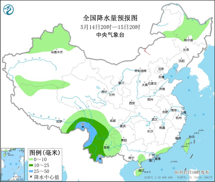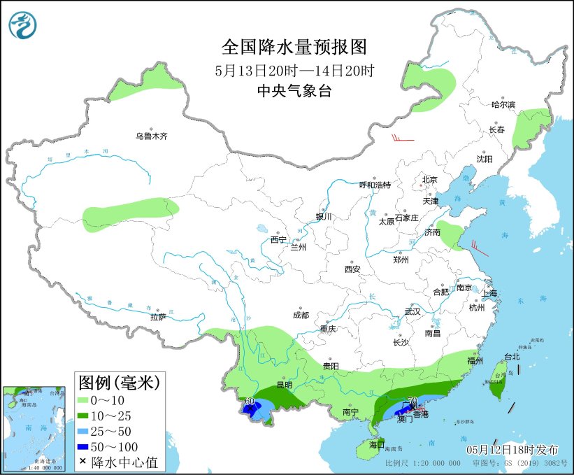 5月13日20时至14日20时,云南南部、广东中南部、台湾岛等地部分地区有中到大雨,其中,云南西南部、广东西南部等地部分地区有暴雨(50~70毫米)。内蒙古中部部分地区有4~5级风(见图3)。