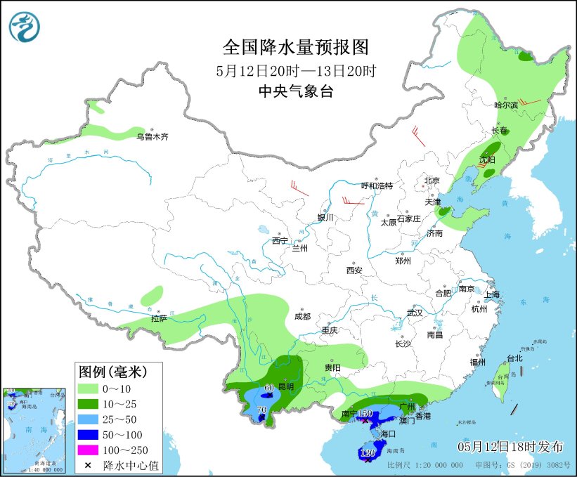 5月12日20时至13日20时,西南地区南部、华南南部和海南岛等地部分地区有中到大雨,其中,云南西南部、广西东南部、广东西南部、海南岛等地部分地区有暴雨或大暴雨(100~150毫米)。内蒙古、东北地区等地部分地区有4~5级风(见图2)。