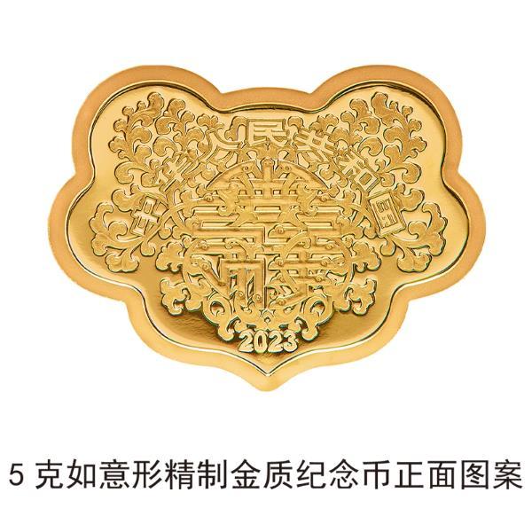 5克如意形金质纪念币为精制币,含纯金5克,外接矩形18毫米×24毫米,面额80元,成色99.9%,最大发行量10000枚。