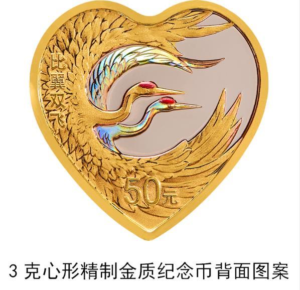 3克心形金质“比翼双飞”纪念币背面图案为双鹤齐飞装饰组合图案,并刊“比翼双飞”字样及面额。