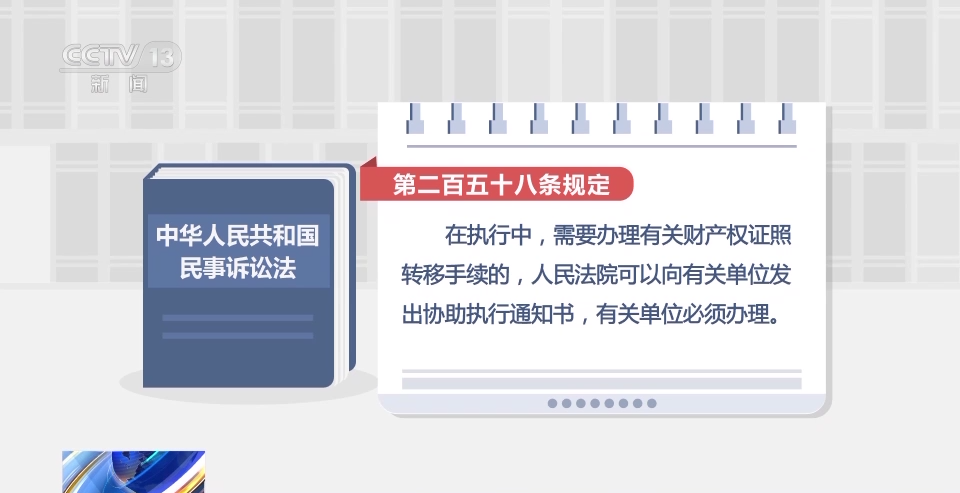 《中华人民共和国民事诉讼法》第二百五十八条规定,在执行中,需要办理有关财产权证照转移手续的,人民法院可以向有关单位发出协助执行通知书,有关单位必须办理。