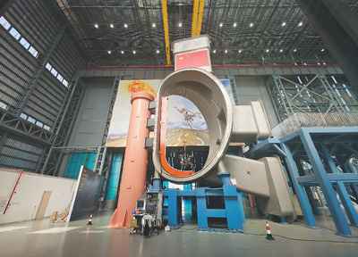 夸父逐日的神话故事代表着中国人追求自然伟力的浪漫情怀与壮志雄心。如今,科技的力量让神话走向现实。巨画的正前方,伫立着一座15米高的可控核聚变堆主机关键系统综合研究设施1/8真空室及总体安装实验平台。