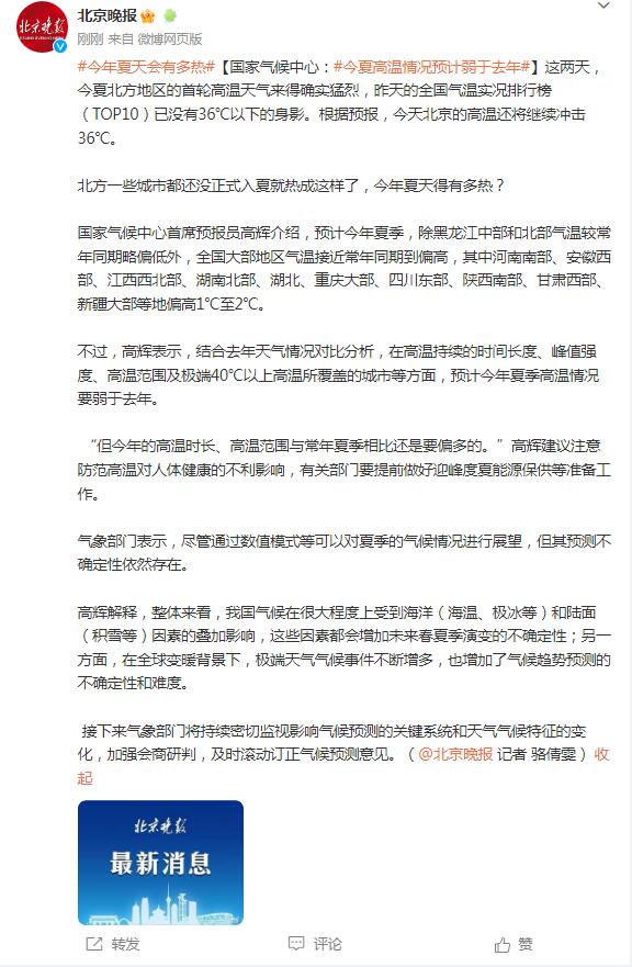 “但今年的高温时长、高温范围与常年夏季相比还是要偏多的。”高辉建议注意防范高温对人体健康的不利影响,有关部门要提前做好迎峰度夏能源保供等准备工作。