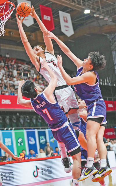 5月14日,北京首钢篮球中心,回浦中学队球员淡厚然(左二)在决赛中完成补篮。