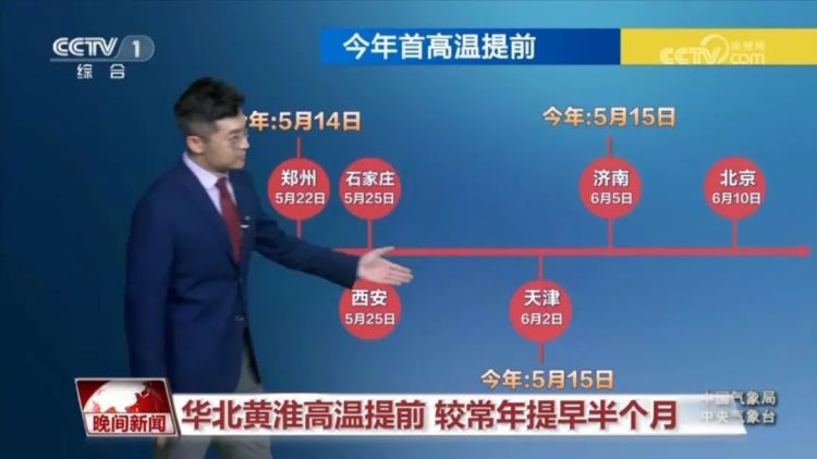 这轮高温天气过程,要比常年同期相对偏早。城市当中,郑州在5月14日,以及天津和济南在5月15日都已经出现了首个高温日,而5月16日,石家庄和北京也有可能会出现高温,要比常年同期偏早半个月左右。