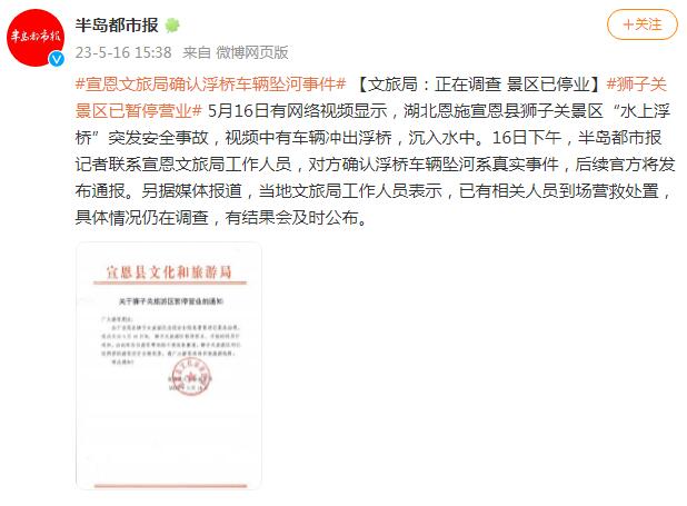 5月16日有网络视频显示,湖北恩施宣恩县狮子关景区“水上浮桥”突发安全事故,视频中有车辆冲出浮桥,沉入水中。16日下午,半岛都市报记者联系宣恩文旅局工作人员,对方确认浮桥车辆坠河系真实事件,后续官方将发布通报。另据媒体报道,当地文旅局工作人员表示,已有相关人员到场营救处置,具体情况仍在调查,有结果会及时公布。