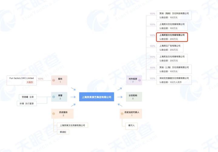 除上海笑笙文化传媒有限公司以外,上海笑果演艺集团有限公司对外投资企业还有6家,注册地址位于上海、深圳、海南。笑果创始人叶烽关联企业中10家为存续状态,包括上海笑果文化传媒有限公司、上海笑友文化传媒有限公司等,其中多数为笑果在各地的文化传媒公司。