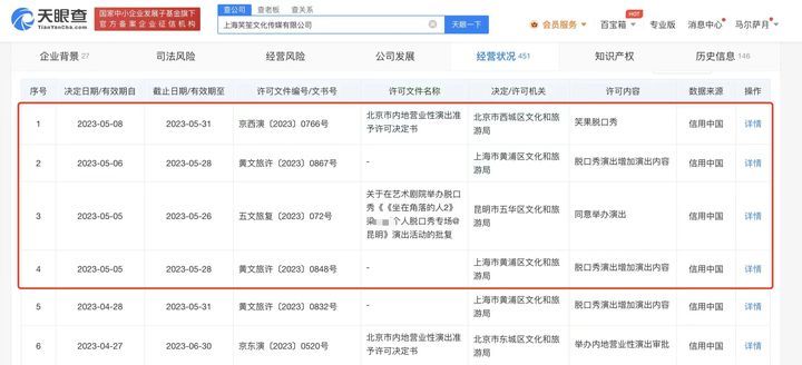 天眼查App显示,涉事上海笑笙文化传媒有限公司成立于2020年5月,法定代表人为叶烽,注册资本200万人民币,由上海笑果演艺集团有限公司全资持股。值得一提的是,今年5月,该公司刚获得多个行政许可,其中包括北京市内地营业性演出准予许可决定书。