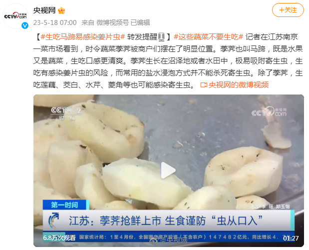 记者在江苏南京一菜市场看到,时令蔬菜荸荠被商户们摆在了明显位置。荸荠也叫马蹄,既是水果又是蔬菜,生吃口感更清爽。荸荠生长在沼泽地或者水田中,极易吸附寄生虫,生吃有感染姜片虫的风险,而常用的盐水浸泡方式并不能杀死寄生虫。除了荸荠,生吃莲藕、茭白、水芹、菱角等也可能感染寄生虫。