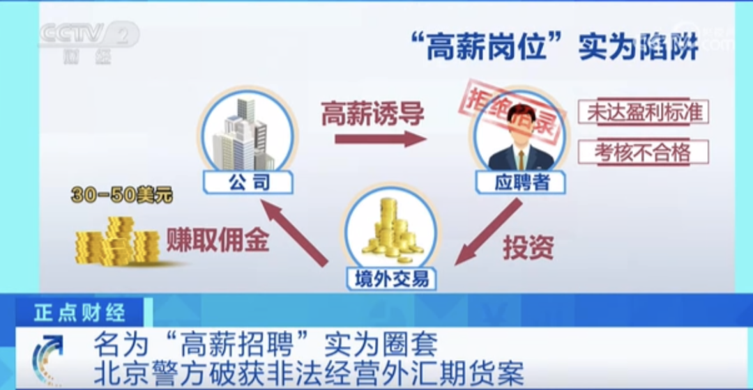 在考核阶段,公司会以高薪为诱饵,诱导应聘者每天都在指定的境外期货交易平台上投资。而公司在每笔交易中,都可以赚取境外平台30至50美元的佣金,直至应聘者的本金在交易中损失耗尽,公司再以“未达到盈利标准、考核不合格”为由,拒绝招录应聘者。目前,北京警方打掉相关犯罪团伙6个,刑事拘留犯罪嫌疑人51人,涉案金额近4亿元 。
