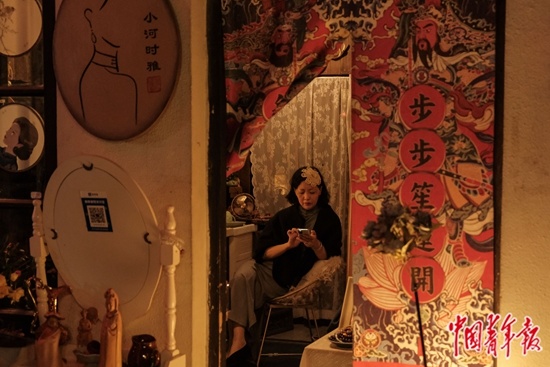 5月1日,浙江杭州,小河直街历史文化街区,一名身着旗袍的店主在店内休息,该店以售卖二手老物件为主。中青报·中青网记者 张玉佳/摄