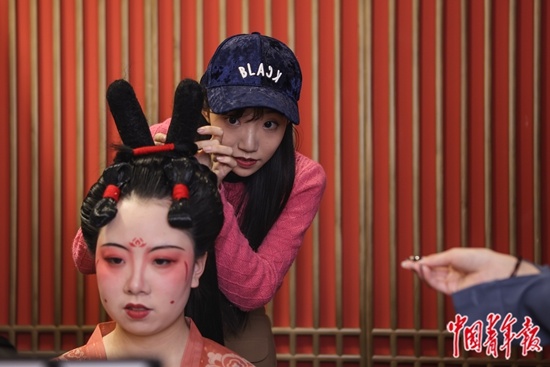 2021年3月9日,北京三里屯,1992年出生的韩爽(右)在自己的汉服体验馆里录制《唐宫夜宴》仿妆教程视频。中青报·中青网记者 曲俊燕/摄