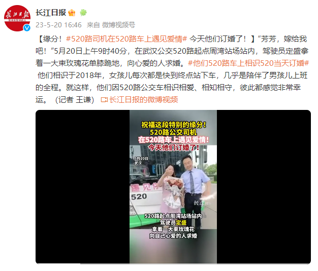 “芳芳,嫁给我吧!”5月20日上午9时40分,在武汉公交520路起点周湾站场站内,驾驶员定盛拿着一大束玫瑰花单膝跪地,向心爱的人求婚。他们相识于2018年,女孩儿每次都是快到终点站下车,几乎是陪伴了男孩儿上班的全程。就这样,他们因520路公交车相识相爱、相知相守,彼此都感觉非常幸运。(记者 王谦)