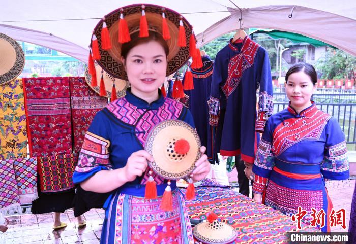 图为毛南族花竹帽及毛南族服饰展示。 杨志雄 摄